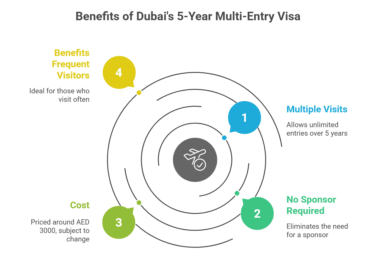 - Under this multi-entry visa, travellers can visit Dubai multiple times for 5 years without applying for a visa every single time.